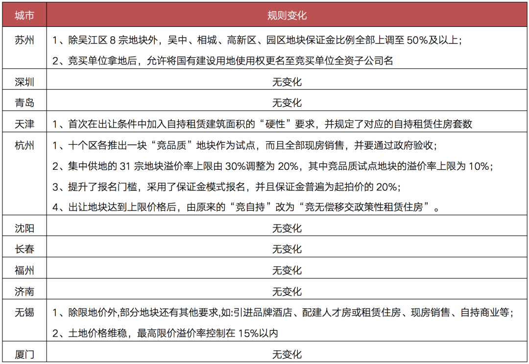 精準調控之下,本輪競拍規則較首輪更加完善和細化,尤其是首輪競拍中市場熱度較高的杭州、無錫、蘇州等城市,均針對其首輪拍地時暴露出的問題,出臺了“打補丁”新規。