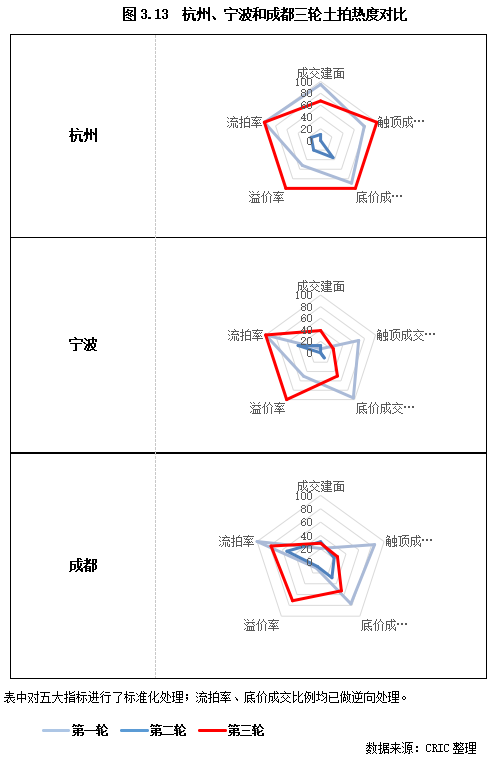 結(jié)合五個(gè)指標(biāo)來(lái)看,第三輪集中土拍明顯回暖的城市僅有三個(gè),分別是杭州、寧波和成都。相比第二輪,三個(gè)城市第三輪觸頂成交地塊比例明顯增加,溢價(jià)率也紛紛回漲到5%左右,并且流拍現(xiàn)象也較第二輪得到極大的改善,僅成都7幅地塊遭遇提前中止,杭州和寧波則無(wú)一宗土地流拍。