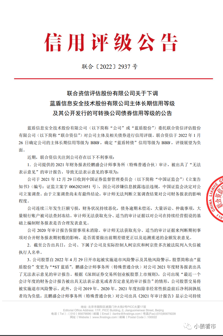5月17日,聯(lián)合資信公告稱,下調(diào)藍(lán)盾股份(300297.SZ)主體長期信用等級為BB,同時下調(diào)“藍(lán)盾轉(zhuǎn)債”的信用等級為BB,評級展望為負(fù)面。