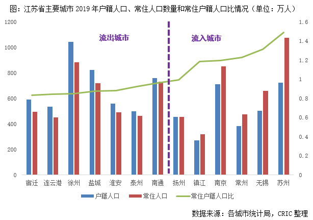 細化到單個城市來看,蘇北城市人口基數相對較大,徐州、鹽城2019年戶籍人口總量基本都在800-1000萬人,屬整個江蘇省城市前列,而宿遷、連云港、淮安人口優勢也比較顯著,2019年戶籍人口總量也在500-600萬人,不過值得關注的是,雖然蘇北戶籍人口總量基數較大,但外溢嚴重,蘇北五城的常住戶籍人口比均小于1,對本城的人口吸附力普遍較差。究其原因,主要與蘇南、蘇北的經濟差異,人口收入密切相關,當地人更愿意選擇去地理區位較近的上海、蘇南打拼,真正留在本地就業的相對較少。