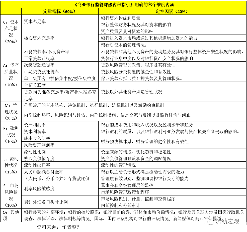 4、監管評級要素由定量和定性兩類評級指標組成。不過《商業銀行監管評級辦法》并沒有披露九個維度的具體評判要素構成,但這里可以參照《商業銀行監管評級內部指引》的規定。