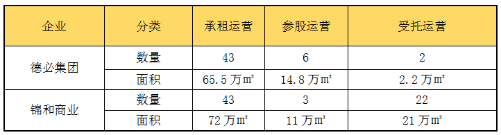 兩家公司的經(jīng)營(yíng)模式主要包括“承租運(yùn)營(yíng)”、“參股運(yùn)營(yíng)”和“受托運(yùn)營(yíng)”三種模式。截至2021年上半年,德必集團(tuán)三種模式下的經(jīng)營(yíng)項(xiàng)目分別為43個(gè)、6個(gè)、2個(gè),錦和商業(yè)分別為43個(gè)、3個(gè)、22個(gè)。