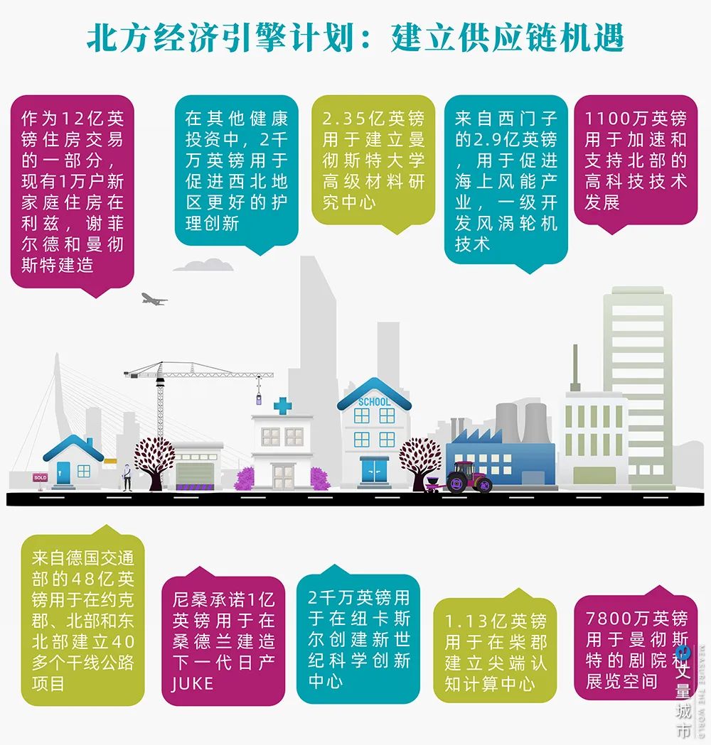 將在交通設(shè)施、商業(yè)、科技創(chuàng)新、教育、文化藝術(shù)等方面,通過下放權(quán)力、行政體制改革、大力發(fā)展基礎(chǔ)設(shè)施建設(shè)、升級(jí)科研、優(yōu)化產(chǎn)業(yè)等措施,用政府財(cái)政撥款和企業(yè)投資相結(jié)合的方式,為北部城市地區(qū)建設(shè)發(fā)展提供資金支持,大力吸引海外投資,帶動(dòng)英國整體發(fā)展。