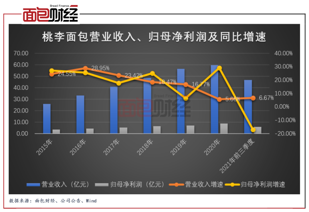 圖2:2015年至2021年前三季度桃李面包營(yíng)業(yè)收入、歸母凈利潤(rùn)及同比增速