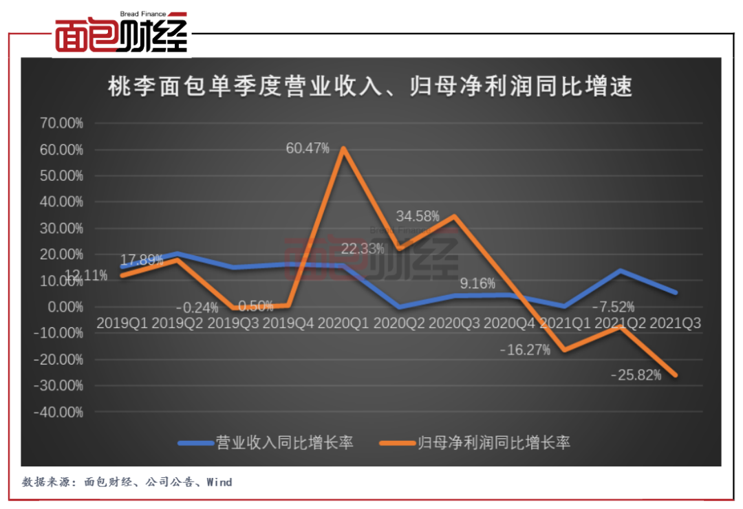 進(jìn)入2021年以來,桃李面包的歸母凈利潤(rùn)出現(xiàn)持續(xù)下滑,第一季度、第二季度分別同比下降16.27%和7.52%。最新披露的第三季度業(yè)績(jī)顯示,公司歸母凈利潤(rùn)增速進(jìn)一步下降至-25.82%。