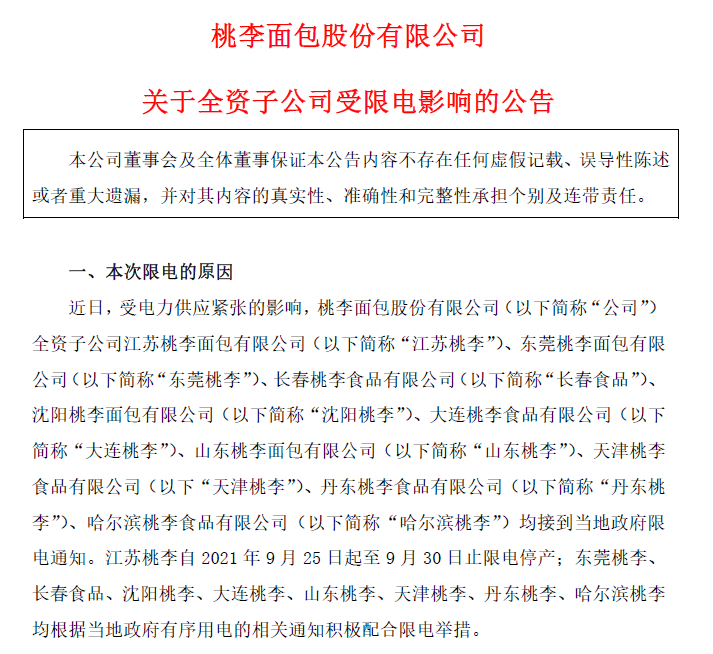 2021年9月底,桃李面包發(fā)布公告稱,近日受電力供應(yīng)緊張的影響,公司旗下江蘇桃李、東莞桃李、長(zhǎng)春食品等多家子公司均接到當(dāng)?shù)卣揠娡ㄖ?/p>