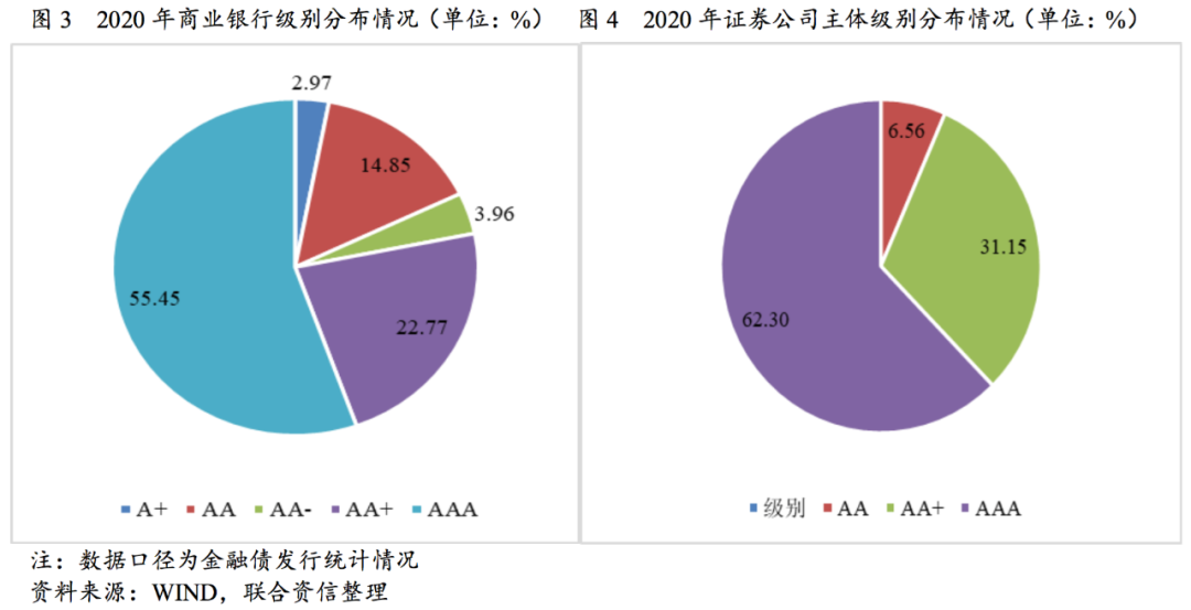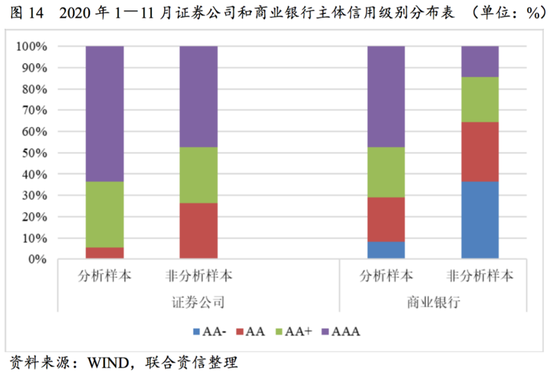 商業(yè)銀行信用級別分布較廣,證券公司高信用級別發(fā)債占比高于商業(yè)銀行。