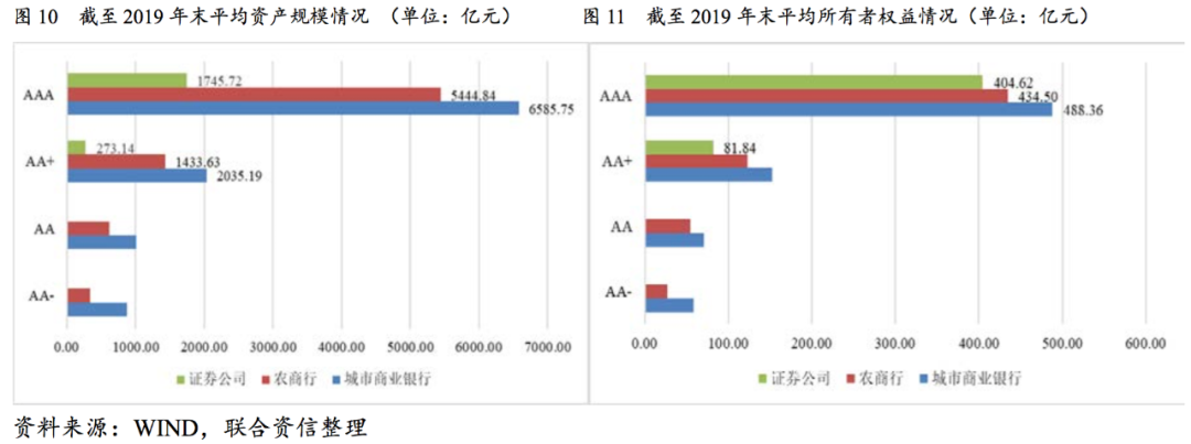 國有商業(yè)銀行和股份制商業(yè)銀行資產(chǎn)規(guī)模、凈利潤等規(guī)模性指標(biāo)明顯優(yōu)于證券公司,且其所在金融系統(tǒng)中具有重要地位。本文選擇債券市場上有存續(xù)主體級別的城商行、農(nóng)商行以及同信用級別的證券公司進行對比。從資產(chǎn)規(guī)模來看,截至2019年末,主體信用級別為AAA級別城商行平均規(guī)模達(dá)6585.75億元,農(nóng)商行次之,整體平均資產(chǎn)規(guī)模為證券公司3.7倍左右,主體信用級別AA+的證券公司與城商行、農(nóng)商行差距達(dá)7~10倍左右;主體信用級別為AAA的城商行平均所有者權(quán)益規(guī)模達(dá)488.36億元,證券公司與其規(guī)模差距明顯低于資產(chǎn)規(guī)模對比情況。