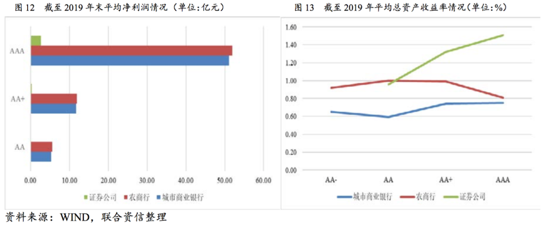 國有商業(yè)銀行和股份制商業(yè)銀行規(guī)模效應(yīng)顯著;同主體信用級別下,城商行和農(nóng)商行資產(chǎn)規(guī)模和凈利潤規(guī)模明顯優(yōu)于證券公司;但所有者權(quán)益方面,AAA主體信用級別證券公司與城商行、農(nóng)商行差距較小,且AA+~AAA級證券公司ROA水平高于城商行和農(nóng)商行。