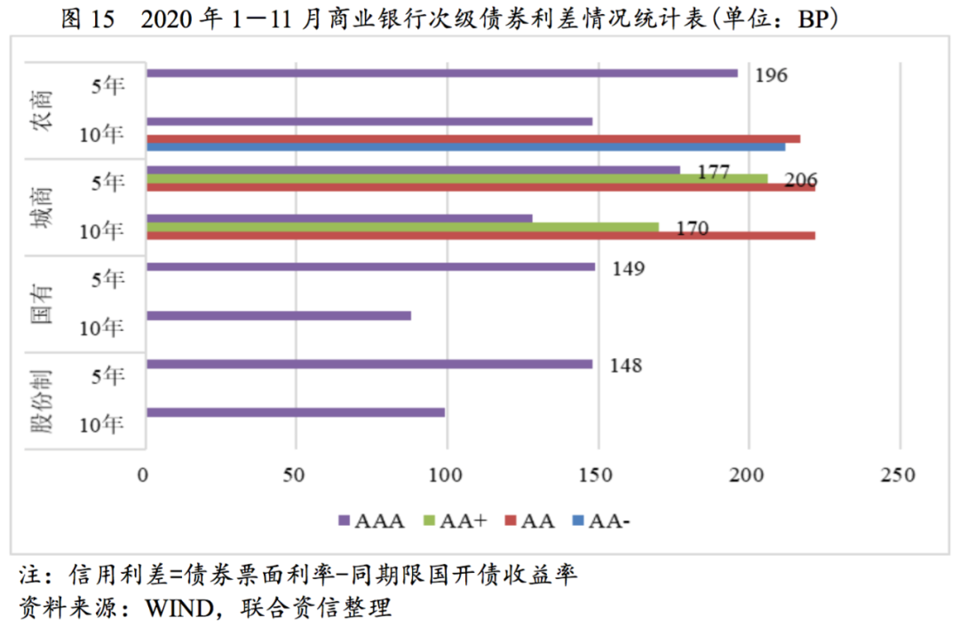 2020年1-11月,證券公司次級債發(fā)行期限1~5年,1年期次級債均為主體信用級別AAA級證券公司發(fā)行。兩年期次級債券AAA級證券公司信用利差低于AA+級33BP,3年期次級債券AAA級信用利差低于AA+級別91BP。5年期AA-主體信用級別樣本較少,個體差異化影響較大。通過商業(yè)銀行和證券公司發(fā)行次級債券信用利差對比,國有商業(yè)銀行和股份制商業(yè)銀行信用利差最低,商業(yè)銀行信用級別之間的利差低于證券公司,但5年期AAA級證券公司次級債券信用利差低于AAA級城商行和農(nóng)商行分別為8BP和28BP。