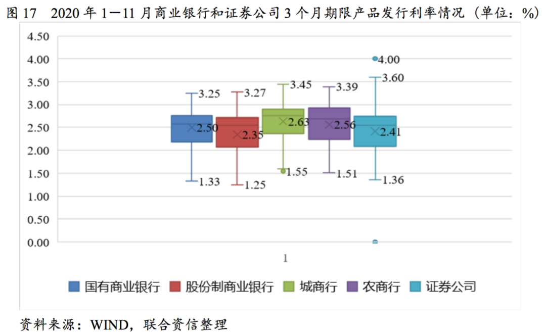 短期限產(chǎn)品中,股份制商業(yè)銀行利率均值最優(yōu),3個月期限產(chǎn)品證券公司發(fā)行利率均值優(yōu)于國有銀行、城商行和農(nóng)商行。6個月、9個月期限產(chǎn)品,證券公司與農(nóng)商行和城商行發(fā)行利率均值差距較小。