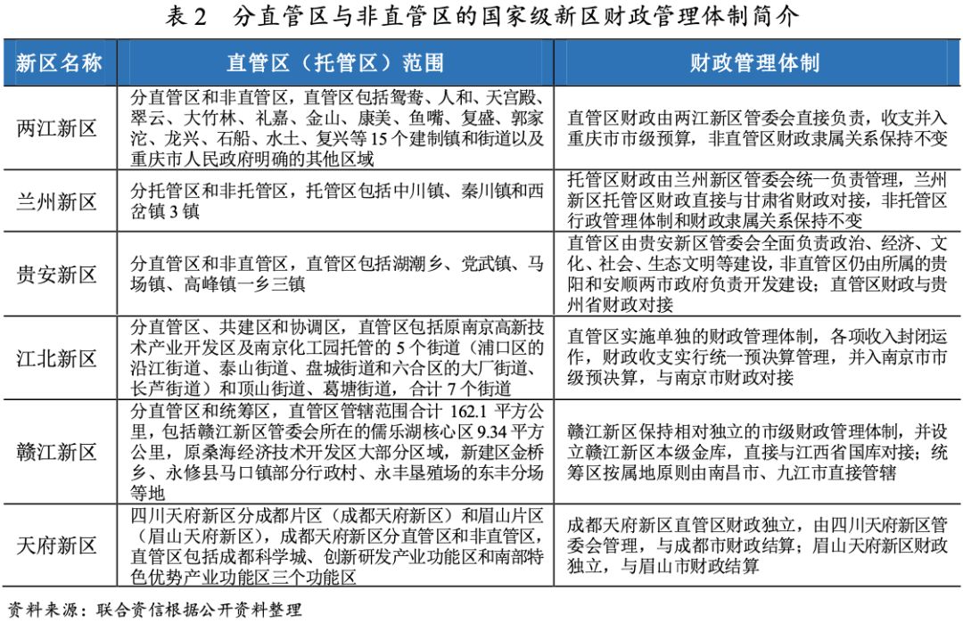 政府型新區(qū)與政區(qū)合一型新區(qū)與正常行政區(qū)財政管理體制一致,均具備獨立財政并對接上級政府金庫直接與上級政府進行結算,財政獨立性、靈活性強。管委會型新區(qū)財政管理體制差異較大:(1)部分新區(qū)分直管區(qū)和非直管區(qū),通常直管區(qū)是新區(qū)發(fā)展的起步區(qū)或重點區(qū)域,直管區(qū)具備獨立財政,非直管區(qū)保持原有的財政隸屬關系不變,此種情況下,新區(qū)財力更多反映的是直管區(qū)范圍內產生的財政收入。