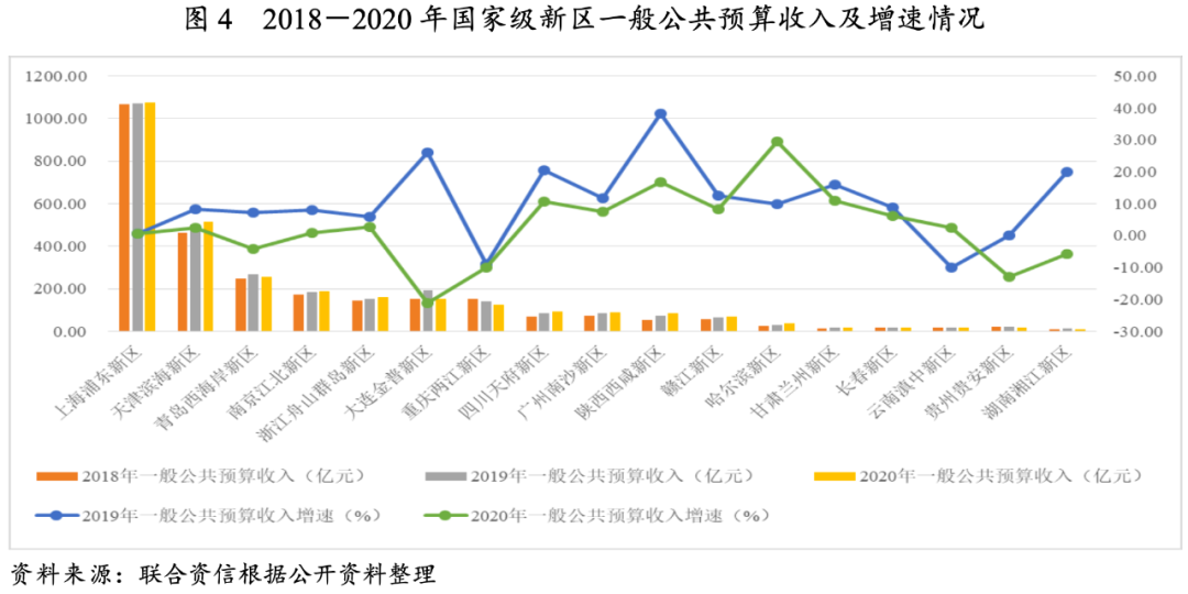 從增長情況來看,2020年受疫情及減稅降費政策等因素影響,國家級新區(qū)一般公共預算收入增速普遍下降,金普新區(qū)、貴安新區(qū)、兩江新區(qū)等一般公共預算收入降幅明顯。