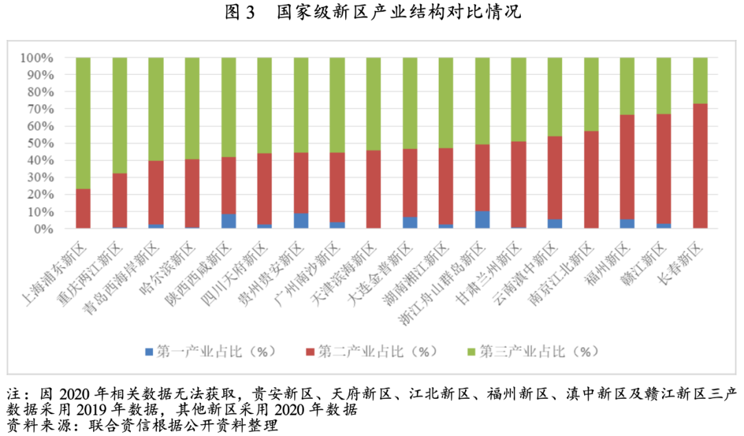 新區(qū)定位、產業(yè)基礎、產業(yè)規(guī)劃及布局造就國家級新區(qū)不同的產業(yè)結構,賦予國家級新區(qū)不同的創(chuàng)稅能力。現(xiàn)階段國家級新區(qū)產業(yè)結構分化明顯,浦東新區(qū)定位“五個中心”,主導金融、航運、貿易、電子信息、智能制造等產業(yè),第三產業(yè)占比高達76.85%;兩江新區(qū)定位為長江上游地區(qū)的經濟中心、金融中心和創(chuàng)新中心,第三產業(yè)占比緊隨浦東新區(qū);貴安新區(qū)依托“大數(shù)據(jù)”提供信息服務拉升第三產業(yè)占比。蘭州新區(qū)定位為承接產業(yè)轉移示范區(qū)、重點布局石化、裝備制造、綠色冶金等產業(yè),福州新區(qū)電子器件、化纖紡織、玻璃陶瓷等制造業(yè)發(fā)達,贛江新區(qū)主導光電信息、生物醫(yī)藥、智能裝備制造、新能源與新材料、有機硅、現(xiàn)代輕紡等六大產業(yè),長春新區(qū)以汽車制造、醫(yī)藥制造、黑色金屬冶煉等為支柱產業(yè),以上新區(qū)第二產業(yè)占比均超過50%。