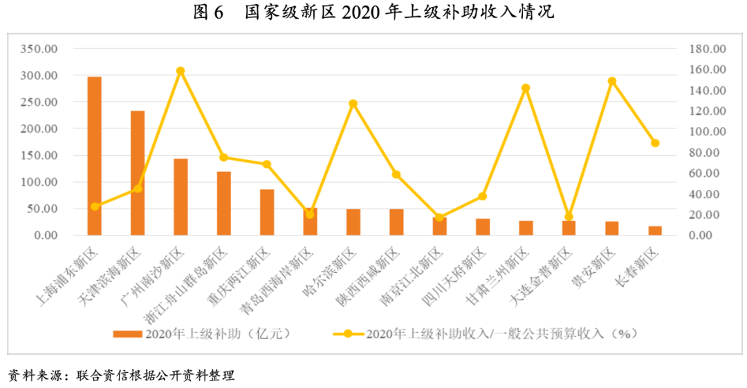 因成立時間、定位及財政結算體制等不同,國家級新區(qū)具體獲得的支持存在較大差異。南沙新區(qū)、貴安新區(qū)、蘭州新區(qū)及哈爾濱新區(qū)等上級補助收入對新區(qū)綜合財力貢獻大。