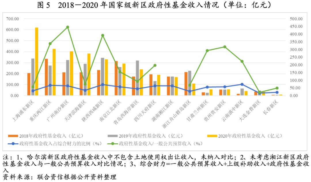 國家級新區(qū)起步階段通常面臨巨大的投資需求,而融資渠道尚不完善,普遍依賴出讓土地獲取開發(fā)建設資金,隨著開發(fā)建設逐步完善,產業(yè)體系構建成熟及人口的聚集,國家級新區(qū)對土地財政的依賴也將逐步減弱。現(xiàn)階段,大部分新區(qū)開發(fā)建設尚未成熟,對土地財政依賴程度仍較高。滇中新區(qū)、西咸新區(qū)、兩江新區(qū)、湘江新區(qū)、天府新區(qū)、南沙新區(qū)等6個新區(qū)政府性基金收入占綜合財力的比重超過60%,南沙新區(qū)、西咸新區(qū)、兩江新區(qū)和貴安新區(qū)的政府性基金收入為一般預算收入的3倍以上,政府性基金收入對財政收入的支撐作用明顯。