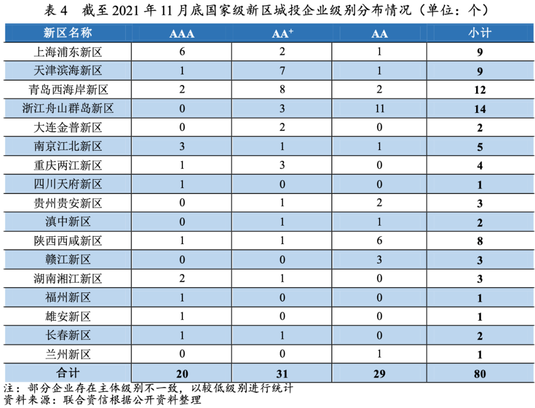 近年來,新區(qū)發(fā)債城投企業(yè)數(shù)量較快增長。AAA及AA+城投企業(yè)占比較高,主要分布在浦東新區(qū)、濱海新區(qū)、西海岸新區(qū)及江北新區(qū)等經濟財政實力較強的國家級新區(qū)。