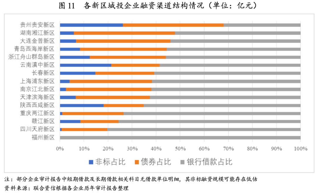國家級新區(qū)城投企業(yè)融資渠道結構差異較大,部分新區(qū)城投企業(yè)融資渠道結構有所失衡,非標及債券市場融資占比較高。