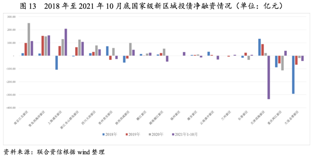 從凈融資規(guī)模來看,國家級新區(qū)城投債凈融資情況分化明顯,2018年至2021年10月底,金普新區(qū)、兩江新區(qū)、濱海新區(qū)和長春新區(qū)城投債凈融資為負。其中,兩江新區(qū)2020年以來城投債集中到期、償還量較大導致報告期間城投債累計凈融資為負;金普新區(qū)、濱海新區(qū)和長春新區(qū)則更多受區(qū)域融資環(huán)境拖累。同期,其他新區(qū)城投債融資均呈凈流入狀態(tài),江北新區(qū)和西海岸新區(qū)城投債凈融資規(guī)模均超過450億元,明顯領先于其他新區(qū);滇中新區(qū)及蘭州新區(qū)城投債凈融資規(guī)模較小。