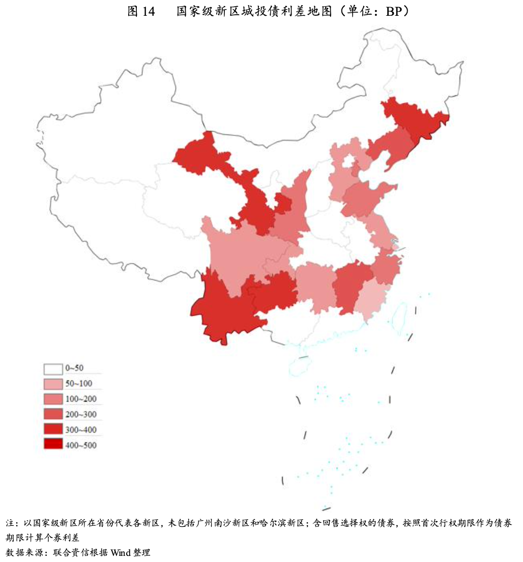 不同新區(qū)城投企業(yè)債券發(fā)行利差分化明顯,浦東新區(qū)、福州新區(qū)、雄安新區(qū)等新區(qū)城投債發(fā)行利差較低,貴安新區(qū)、滇中新區(qū)、長春新區(qū)、蘭州新區(qū)等城投債發(fā)行利差較高。