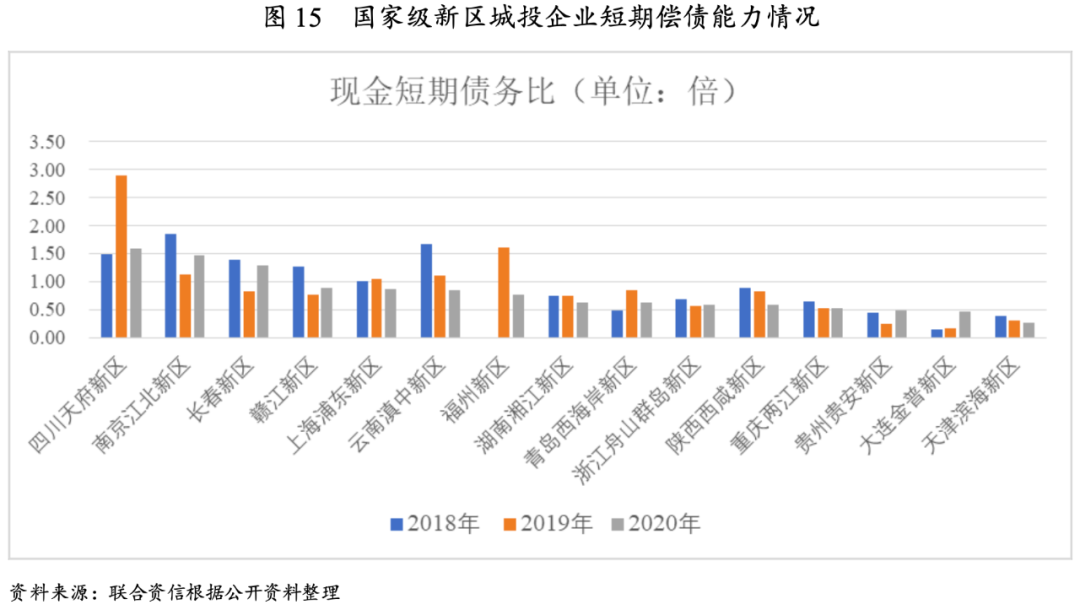 2018-2020年底,國家級新區(qū)城投企業(yè)短期償債能力指標整體弱化。2020年底,國家級新區(qū)城投企業(yè)現(xiàn)金短期債務比下降至0.66倍,大多數(shù)新區(qū)發(fā)債城投存在短期償付壓力。具體來看,各新區(qū)城投短期償債能力指標表現(xiàn)明顯分化,其中浦東新區(qū)、江北新區(qū)、四川天府新區(qū)城投企業(yè)凈融資規(guī)模較大、賬面資金較充裕;長春新區(qū)開發(fā)投資進度較慢、相關城投企業(yè)賬面留存較大規(guī)模現(xiàn)金,以上新區(qū)城投企業(yè)短期償債能力指標表現(xiàn)較強。濱海新區(qū)、金普新區(qū)和貴安新區(qū)城投企業(yè)短期償債能力指標較弱,其中,濱海新區(qū)城投企業(yè)短期債務規(guī)模大,近三年現(xiàn)金短期債務比持續(xù)下降,流動性壓力較為突出。隨著債務集中到期,兩江新區(qū)、西咸新區(qū)和湘江新區(qū)等新區(qū)城投企業(yè)短期償債能力有所弱化。