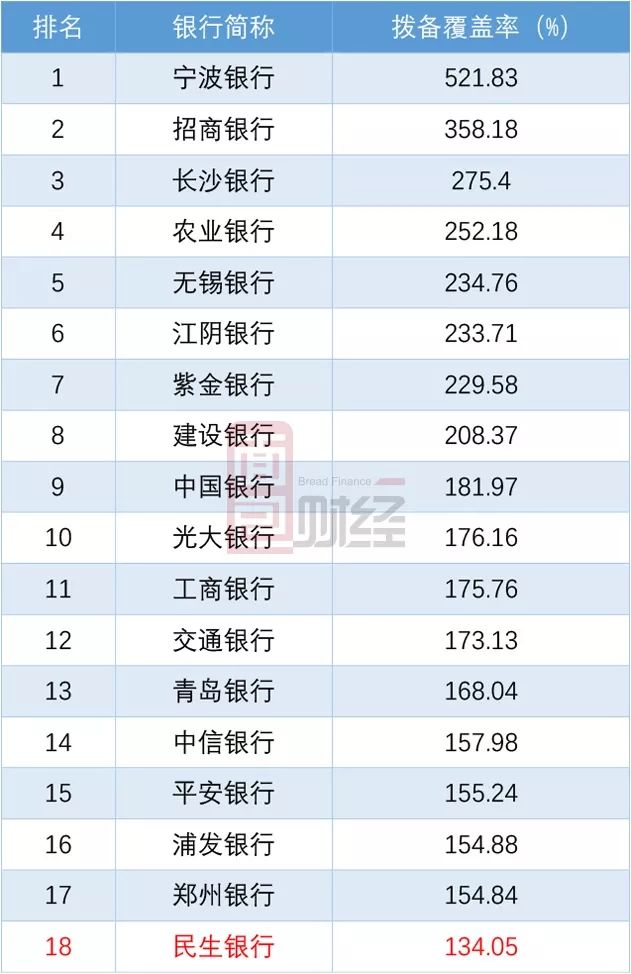 從目前已發布年報的18家上市銀行來看,民生銀行的撥備覆蓋率最低: