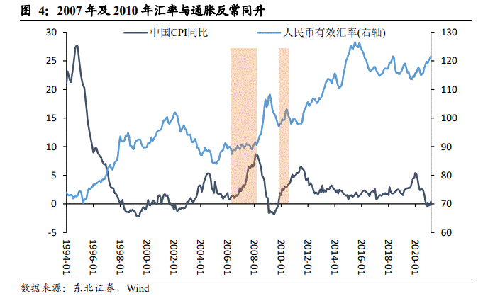 同時(shí)注意人民幣的走勢(shì)。一般來說,物價(jià)走高和匯率是反的。但是2007年、2010-2011年兩段輸入性物價(jià)壓力比較大的時(shí)期,人民幣卻反常升值。