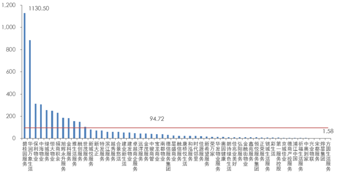 其次是華潤萬象生活,截止2022年3月31日數據,市值為884.47億港元,同樣顯著領先于其他上市物企。