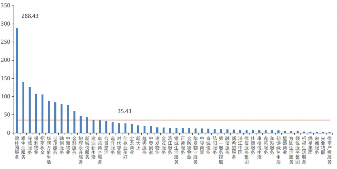 2021年披露年度在管面積的49家上市物企中,在管規模超過億平方米量級的物企達16家,超過均值(1.10億平方米)的物企為14家。其中,碧桂園服務在管面積達7.66億平方米,躍居上市物企在管規模之首;雅生活服務、保利物業和綠城服務在管面積均超過3億平方米;在管面積前五的企業規模總值達23.05億平方米,在上市物企中總規模占比超四成,上市物企的分化日益加大。