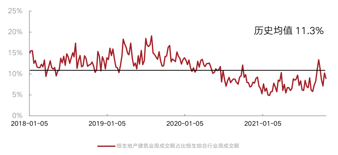 10月,恒生地產建筑業(yè)指數(shù)的成交額占恒生綜合行業(yè)總成交額之比月均值較上月回落。本月周均值8.8%,低于18年至今的歷史均值11.3%,較上月下降1.5個百分點,成交額出現(xiàn)回落。