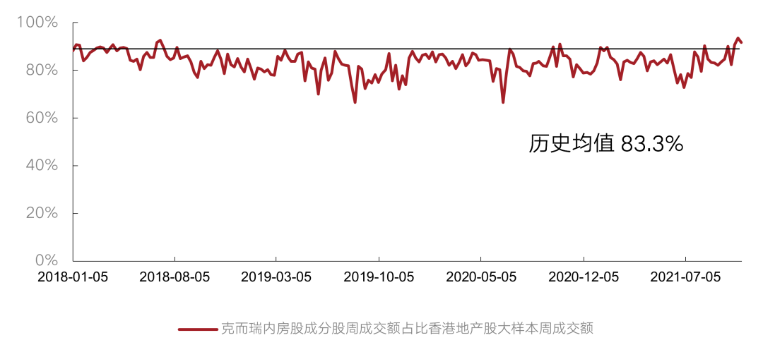 10月克而瑞內房股領先指數(shù)成交額占香港地產股大樣本的成交額比值總體較上月上升。10月該指數(shù)成交額占比周均值89.6%,高于歷史均值83.3%,高于上月周均值84.7%。