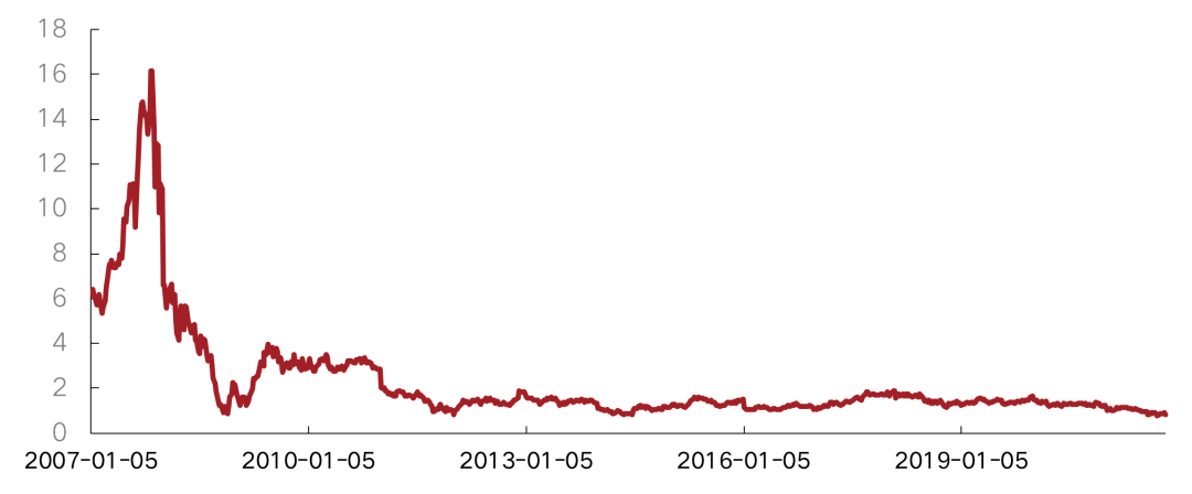 圖:克而瑞內房股領先指數(shù)PB估值走勢持續(xù)下行