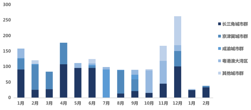 內(nèi)地大宗成交物業(yè)城市群分布(成交金額,2020.01-2021.02)