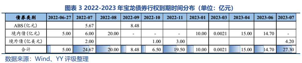 YY去年對寶龍的跟蹤報告曾指出,寶龍在2022年面臨集中到期大考(2022年有80億元人民幣+7億美元+10億港元債券行權或到期)。2022年以來,寶龍如同其他高收益民企,接連遭遇銷售額腰斬、資本市場融資受阻等困境,而年報顯示21年末非受限貨幣資金/短期債務比僅有0.88,出現資金缺口。寶龍于上半年勉力還債后,今年6-12月還有45.15億元境內債(含ABS)+6億美元境外債面臨行權或到期,折合人民幣約85億元。集中兌付壓力下不容喘息。