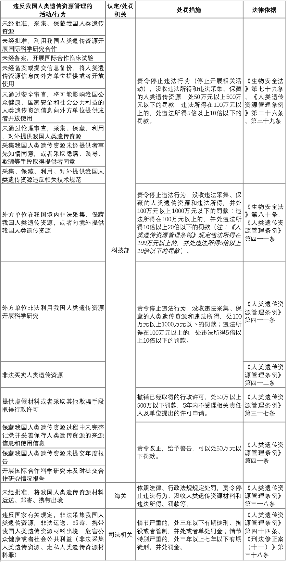 隨著相關(guān)法律法規(guī)的進(jìn)一步完善,對(duì)人類遺傳資源管理違法行為的打擊力度也得到了進(jìn)一步的提升。筆者根據(jù)相關(guān)規(guī)定,對(duì)違反我國(guó)人類遺傳資源管理規(guī)定的相關(guān)活動(dòng)和行為將面臨的主要行政責(zé)任和刑事責(zé)任總結(jié)如下: