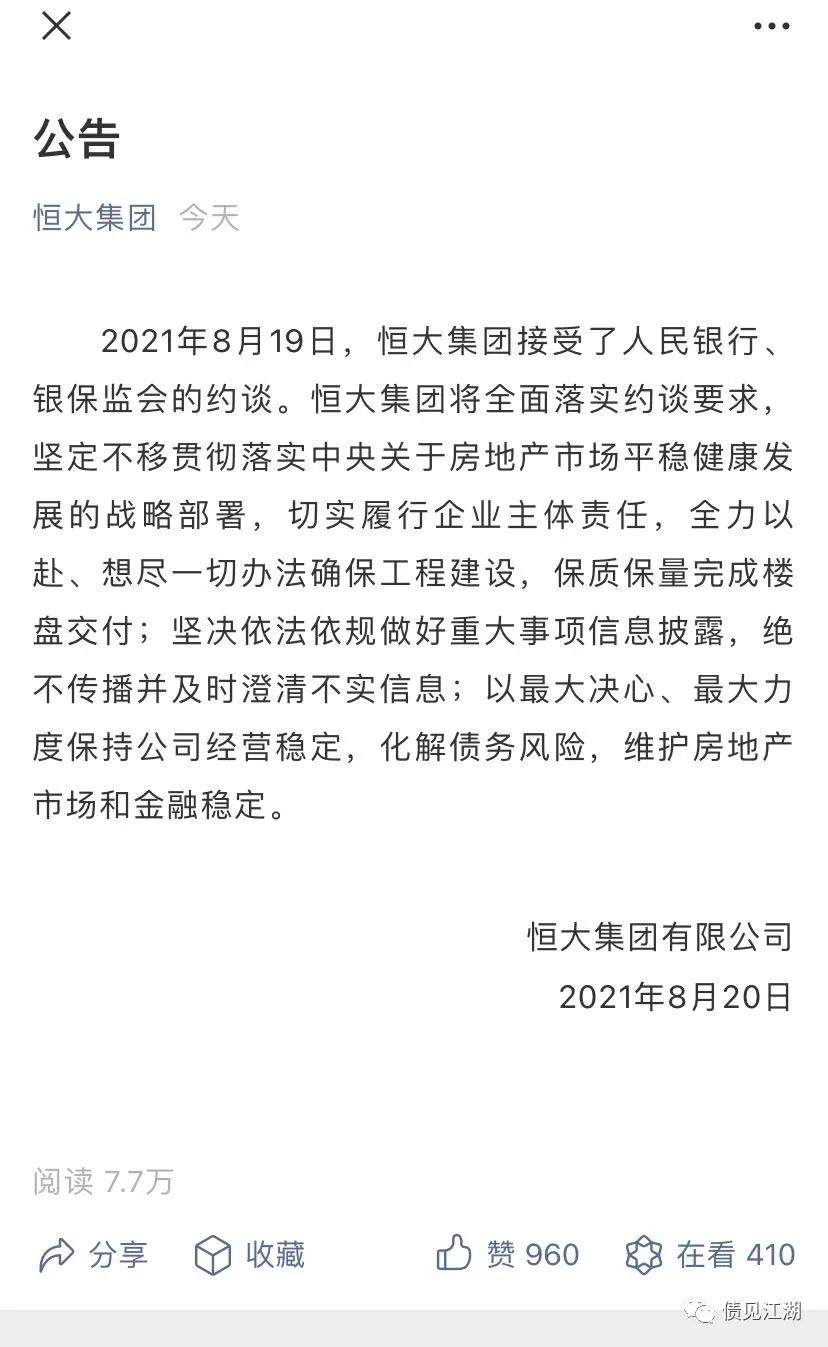 人民銀行、銀保監會約談恒大集團,恒大集團今日回應
