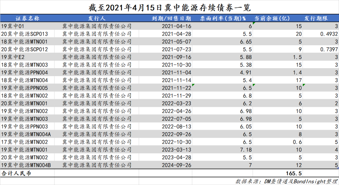 集團(tuán)旗下發(fā)債平臺共計(jì)四個,分別為冀中能源股份有限公司、華北制藥股份有限公司、冀中能源國際物流集團(tuán)有限公司和冀中能源峰峰集團(tuán)有限公司。冀中能源集團(tuán)有限責(zé)任公司作為母公司是主要發(fā)債主體,截至2021年4月15日,冀中能源集團(tuán)存續(xù)的境內(nèi)債共19支,合計(jì)約165.5億元,無存續(xù)境外債。