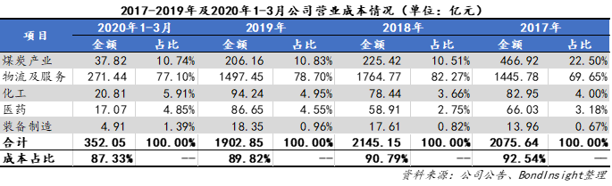 公司營業(yè)成本近年緩慢下調(diào),2020年1-3月占營業(yè)收入的87.33%,整體營業(yè)成本較高,主要由于公司物流及服務(wù)板塊業(yè)務(wù)成本較高,且近年快速上漲。2018年,該板塊業(yè)務(wù)上漲22.06%至1,764.77億元,2019-2020年有所下降,但占比仍在78%左右,為公司營業(yè)成本最大項(xiàng)。