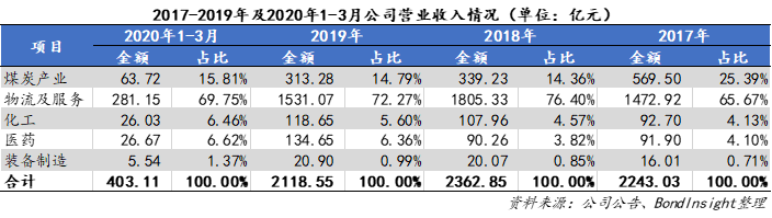 冀中能源目前已形成以煤炭產(chǎn)業(yè)為基礎(chǔ),制藥、化工為支柱,機(jī)械制造、物流及服務(wù)業(yè)為支持的產(chǎn)業(yè)格局。整體來看,公司營業(yè)收入自2017年起緩慢下降,2017-2019年分別為2,243.03億元、2,362.85億元及2,118.55億元,下降約5.55%,主要為煤炭產(chǎn)業(yè)營收下降及物流服務(wù)板塊收入不穩(wěn)定所致。自2018年始,公司煤炭產(chǎn)業(yè)占營收比例已不足15%,物流及服務(wù)業(yè)占比超過70%,化工、醫(yī)藥及裝備制造體量較小,近年有所上升,但仍不足10%。