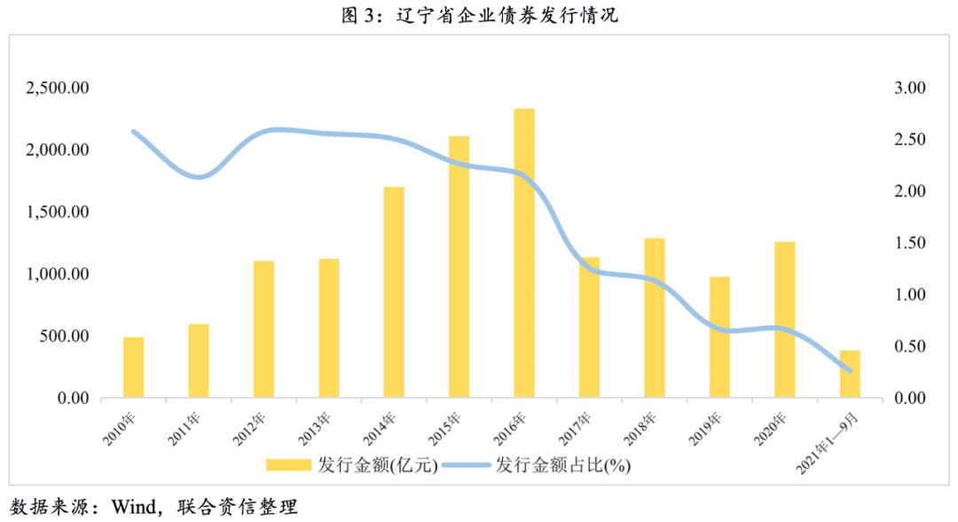 2016年3月,地方國(guó)有企業(yè)東北特殊鋼集團(tuán)股份有限公司發(fā)行的“15東特鋼CP001”觸發(fā)實(shí)質(zhì)性違約,截至2021年11月末,合計(jì)違約債券余額71.70億元;2020年10月,華晨汽車集團(tuán)控股有限公司觸發(fā)實(shí)質(zhì)性違約,截至2021年11月末,違約債券余額172.00億元。近年來,持續(xù)發(fā)生的公開市場(chǎng)違約以及部分地方國(guó)有企業(yè)打破剛兌都給遼寧省信用聲譽(yù)造成不利影響,資本市場(chǎng)債券發(fā)行規(guī)模明顯下降。從圖3中看出,2016年以后,遼寧省整體債券發(fā)行規(guī)模及占當(dāng)年全國(guó)債券發(fā)行規(guī)模的比重都呈明顯下降態(tài)勢(shì)。