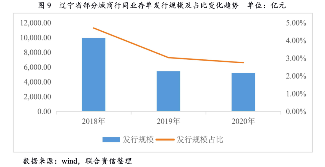 作為最早一批改革的城商行,遼寧省城商行業(yè)務(wù)種類較為豐富,同業(yè)負(fù)債來源廣泛。近年來,資本市場(chǎng)對(duì)于遼寧省內(nèi)信用環(huán)境持審慎態(tài)度,對(duì)遼寧省整體城商行流動(dòng)性產(chǎn)生一定影響。從遼寧省城商行同業(yè)存單發(fā)行規(guī)模來看,2018—2020年,遼寧省城商行同業(yè)存單發(fā)行規(guī)模持續(xù)下降,且占市場(chǎng)同業(yè)存單發(fā)行總量的比重持續(xù)下滑。從同業(yè)存單發(fā)行利率來看,樣本選取遼寧省城商行一年期同業(yè)存單發(fā)行利率,與一年期中債國(guó)債到期收益率進(jìn)行比較,2020年遼寧省城商行同業(yè)存單發(fā)行規(guī)模下降的同時(shí),利差明顯擴(kuò)大。2019年,遼寧省城商行同業(yè)存單平均發(fā)行利差為0.88個(gè)百分點(diǎn),2020年平均發(fā)行利差擴(kuò)大至2個(gè)百分點(diǎn)。如前文所述,在存款業(yè)務(wù)拓展壓力加大的同時(shí),遼寧省城商行同業(yè)融入規(guī)模有所收縮,且融資成本上升,同業(yè)負(fù)債業(yè)務(wù)難度有所上升。