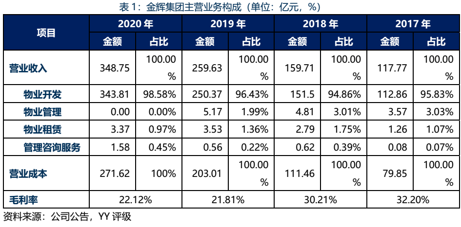 金輝集團主營業務專營銷售型產品,投資物業貢獻收入較低。17年至今,公司毛利率逐年降低,或受制于公司15年起的高價拿地所致。
