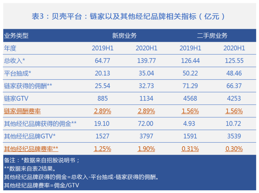 (備注:對于計算過程做一個贅述:根據(jù)調(diào)研,2019-2020的時間段鏈家二手房交易費率基本一致,此外招股書顯示平臺二手房抽成變動很小、忽略不計(表1),故鏈家二手房傭酬費鎖定,鏈家獲得傭酬費總額已經(jīng)在招股書中披露,則新房銷售的傭酬費(率)=傭酬總額-二手房傭酬費也是確定的。此外,我們根據(jù)計算得到的鏈家的傭酬費率帶入2019年全年驗算,全年數(shù)據(jù)與報表基本吻合。)