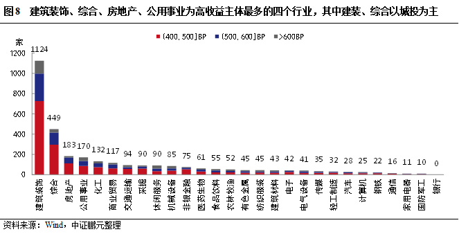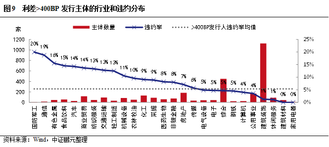行業分布和違約特征方面,從統計數據來看,建筑裝飾是高收益主體數量最多的行業,僅其一個行業就占全部高收益主體的35%;其次是綜合、房地產、公用事業,也是一級市場高收益債發行主體的主要分布行業(圖8)。前四個行業占全部高收益主體的60%。但建筑裝飾、綜合行業的高收益主體中有較大比例為城投,也就是說有相當數量的弱資質城投其發行利差還是偏高的。