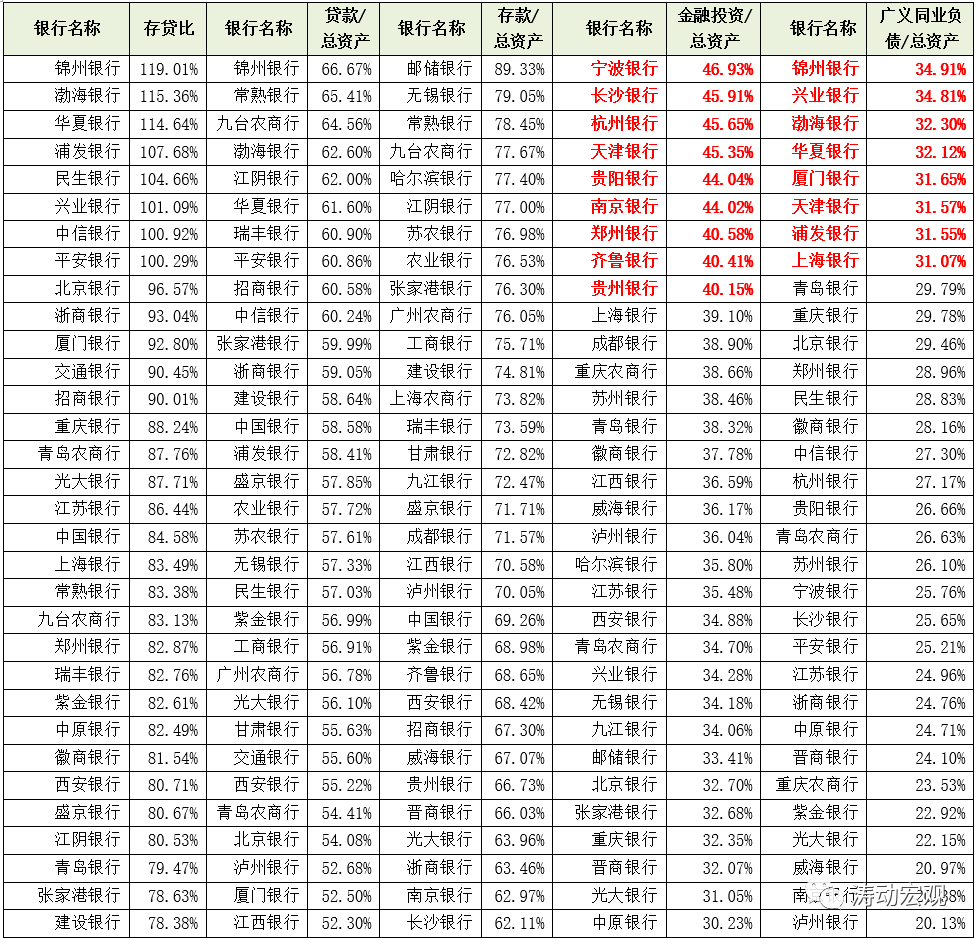 我們從存貸比、貸款/總資產、存款/總資產、金融投資/總資產以及廣義同業負債/總資產等四個指標來剖析上市銀行的資產負債結構。整體來看,