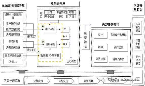 信用風險計量是現代信用風險管理的基礎和關鍵環節,信用風險計量經歷了專家判斷法(即長期在一線業務骨干在承擔信用風險過程中逐步發展并完善起來的傳統信用分析方法,主要考察與債務人相關的聲譽、杠桿和收益波動性等指標,及與市場相關的經濟周期、宏觀經濟政策、利率水平等指標)、信用評分模型到違約概率模型三個主要發展階段。現在對于信用風險的計量主要依賴于對借款人和交易風險的評估,主要是從客戶評級維度和債項評級維度兩個方向展開。