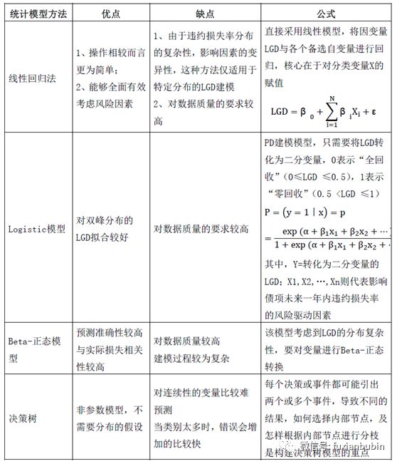 最后則是設計、建立統計模型,并給予實際業務經驗對模型及其估值參數進行調整,進而彌補不完善的數據,使模型的參數更加符合實際業務經驗。最終通過LGD值與債項等級的映射,構建債項評級體系。根據金融機構的業務特色,金融機構可結合各自的資源稟賦和各個統計模型的優缺點,從中篩選適合自身的統計模型(統計模型方法如下表):