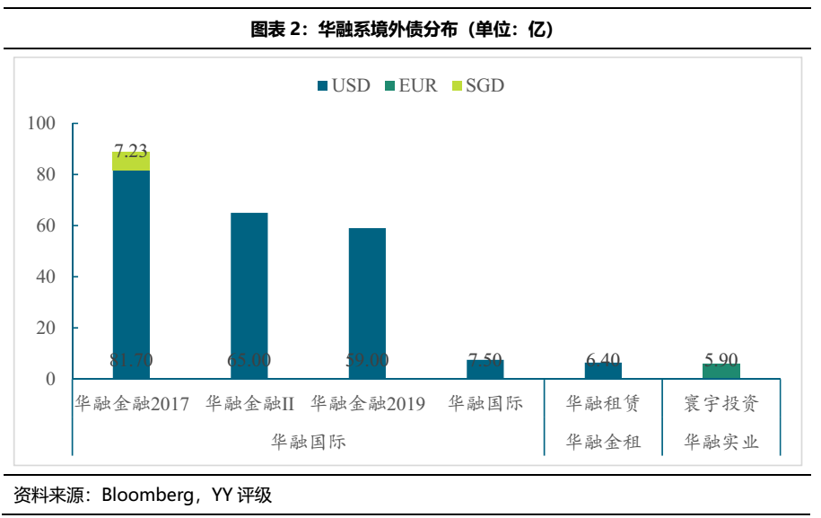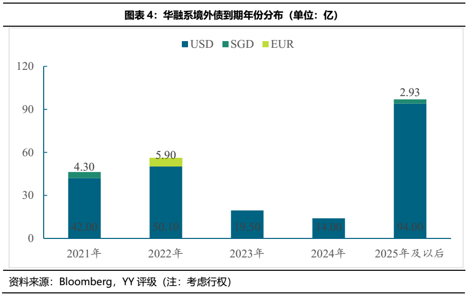 其中中國(guó)華融的二級(jí)子公司和三級(jí)子公司(除華融晉商)主要是作為SPV在境外發(fā)債,其境外債的最終債務(wù)人為中國(guó)華融的一級(jí)子公司。截至21年4月7日,華融系存續(xù)境外債合計(jì)219.60億美元、5.9億歐元及7.23億新加坡元,主要分布在華融國(guó)際、華融金租和華融實(shí)業(yè)三個(gè)一級(jí)子公司,其中華融國(guó)際目前的存續(xù)債規(guī)模最大。