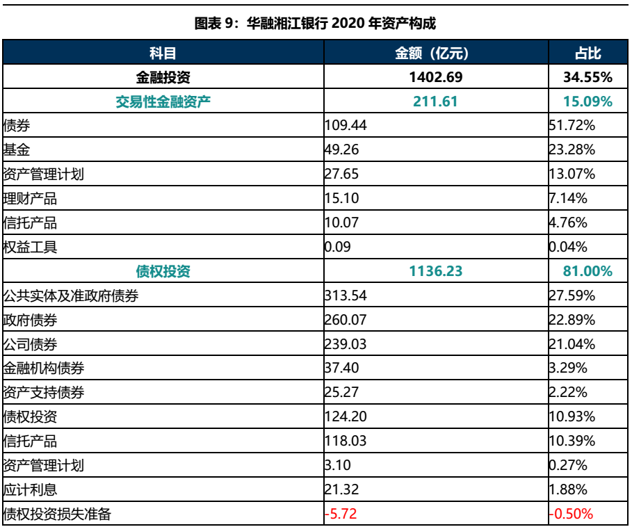 華融湘江銀行2020年資產(chǎn)總計(jì)4,059.76億元,主要由金融投資和發(fā)放貸款及墊款構(gòu)成,二者合計(jì)占比89.29%。其中金融投資主要為債權(quán)投資,從明細(xì)來(lái)看,華融湘江銀行金融投資主要投向債券類(lèi)資產(chǎn);發(fā)放貸款及墊款則主要面向個(gè)人,水利、環(huán)境和公共設(shè)施管理業(yè),房地產(chǎn),建筑業(yè)和制造業(yè)等行業(yè)。