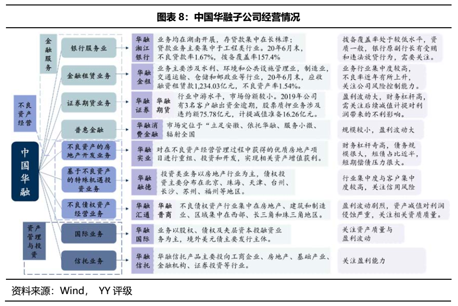 中國(guó)華融聚焦不良資產(chǎn)的收購(gòu)、管理與處置,業(yè)務(wù)主要分為不良資產(chǎn)經(jīng)營(yíng)、金融服務(wù)和資產(chǎn)管理與投資三大板塊。其中不良資產(chǎn)經(jīng)營(yíng)業(yè)務(wù)包括不良債權(quán)資產(chǎn)經(jīng)營(yíng)、政策性債轉(zhuǎn)股業(yè)務(wù)、市場(chǎng)化債轉(zhuǎn)股業(yè)務(wù)以及子公司開(kāi)展的不良債權(quán)資產(chǎn)經(jīng)營(yíng)業(yè)務(wù)、基于不良資產(chǎn)的特殊機(jī)遇投資業(yè)務(wù)、基于不良資產(chǎn)的房地產(chǎn)開(kāi)發(fā)業(yè)務(wù);公司金融服務(wù)和資產(chǎn)管理與投資業(yè)務(wù)則主要由子公司負(fù)責(zé)經(jīng)營(yíng)。